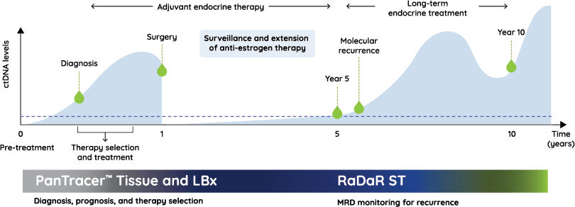 Additionally, when endocrine-responsive biomarkers indicate high recurrence risk despite anti-estrogen therapy, integrating RaDaR ST testing can refine treatment decisions by detecting and monitoring circulating tumor DNA for more comprehensive risk assessment.