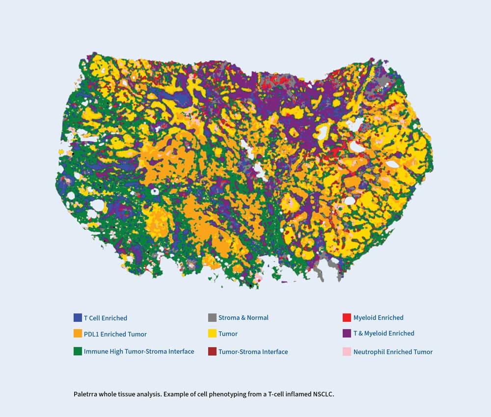 Paletrra,™ exclusively available from NeoGenomics, combines whole-tissue workflow, AI-driven image analysis, and advanced spatial analytics to deliver comprehensive TME insights without requiring end-user optimization. It enables profiling of up to 60+ protein biomarkers within a single tissue section, offering both multiplex and hyperplex options.
