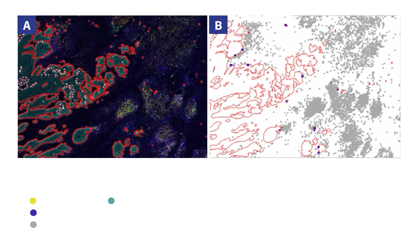 • Image Analysis by Indica HALO: single cell quantitative cellular classification, spatial analysis including nearest neighbors, and density heatmaps, combine analysis and results – specific compartment for same slide or serial slides.